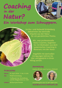„Coaching in der Natur? Ein Workshop zum Schnuppern.“ am Sonntag, 19. April 2026 von 11:00 bis 15:00 Uhr im Kur- und Heilwald, Schömberg. Weitere Informationen zum Workshop erhalten Sie hier.